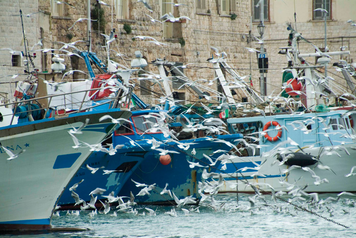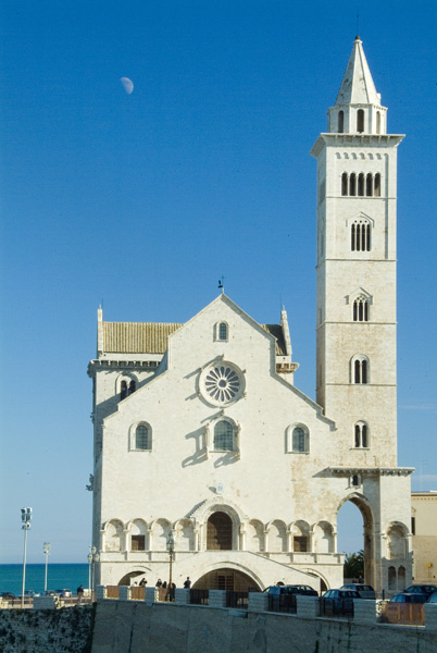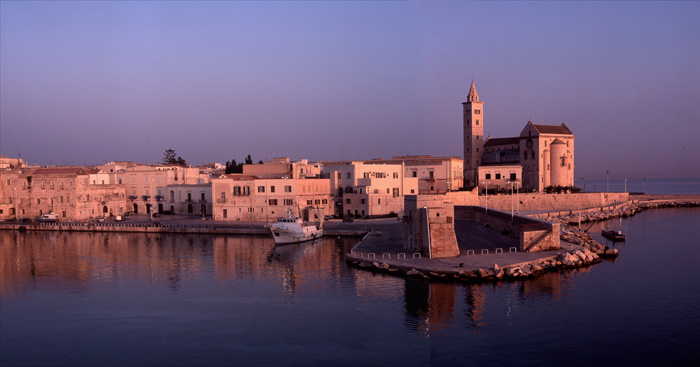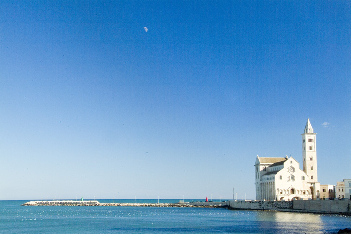 Poi Trani è una città di mare, bella ed elegante come la gente di mare. Una morbida conca che neanche Montecarlo. Con i gabbiani librati in una luce che sembra venire dritta dritta dal paradiso. Ma un mare di amore e odio. Non per niente la cattedrale, la più bella di Puglia, svetta sulla costa come segno di devozione dei marinai, sempre a caccia di protezione divina, ma anche come sentinella dai grandi occhi, faro per l’approdo nelle salsedini. Monumentale come un iceberg, “s’innalza compatta, quasi d’impeto, a suscitare il fremito dei naviganti”, e forse anche ad “arpionare un po’ della loro anima”.