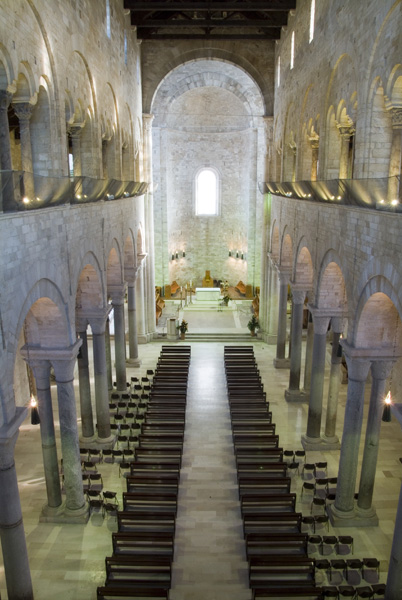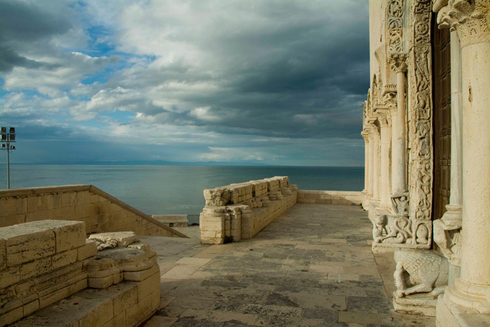 Correva l’anno 1094 quando un invasato giovinetto, brandendo la croce e gridando “Kyrie Eléison”, dopo aver percorso scalzo la sua Grecia e camminando sulle acque per Otranto e Taranto, arrivò qui stremato. Era un “pazzo di Dio” deriso e perseguitato, e dopo quattro giorni esalò l’ultimo respiro. Un pellegrino di nome Nicola che poteva essere il santo buono per competere col molto più famoso vescovo Nicola della vicina e odiata Bari. Così la cattedrale s’innalzò a suo nome. Scrisse il giornalista napoletano Cesare Malpica nel 1840: “Se qualcuno visiterà queste sponde non si perda in vane parole per ritrarre questo mare deserto, questo tempio che biancheggia, quel campanile che si innalza come un vecchio gigante ad attestare l’ardimento artistico. Ammiri la scena e taccia”.