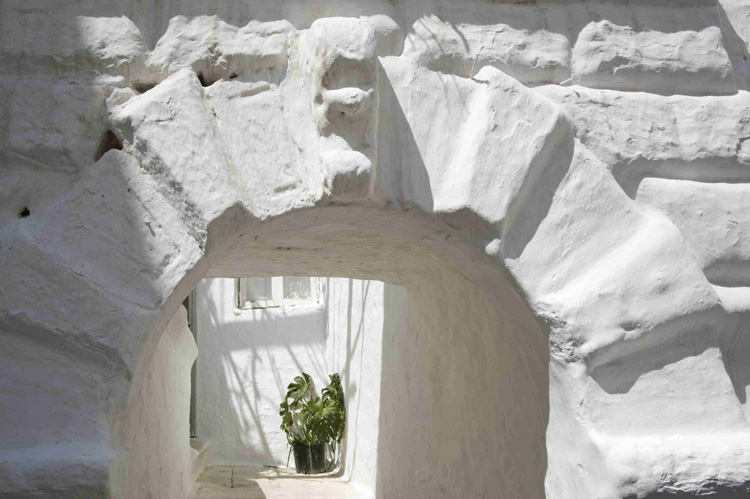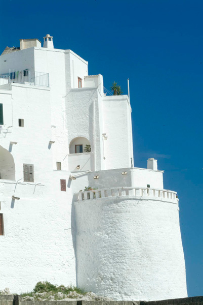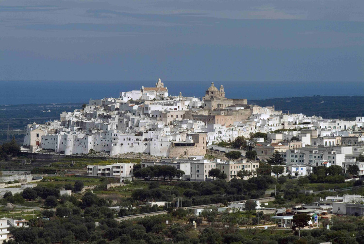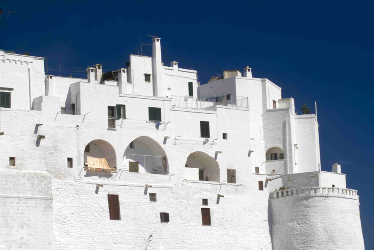 Perché a chi viene dal mare, Ostuni sembra l’astronave di Incontri ravvicinati del terzo tipo come nel film di Spielberg, pronta a schizzare verso l’infinito, tutta tonda e luccicante nelle massicce mura. Lassù, ai suoi 240 metri, Ostuni si porge come un rifugio contro i furori dell’afa che impiomba i lunghi arenili laggiù, dove popolosi ma discreti si stendono i villaggi di Rosa Marina e Monticelli prima del chiassoso supermarket turistico di Villanova, l’antico porto romano.