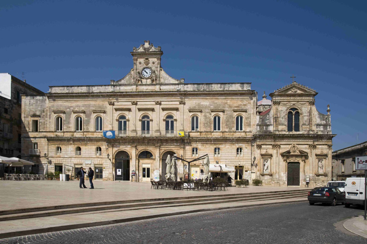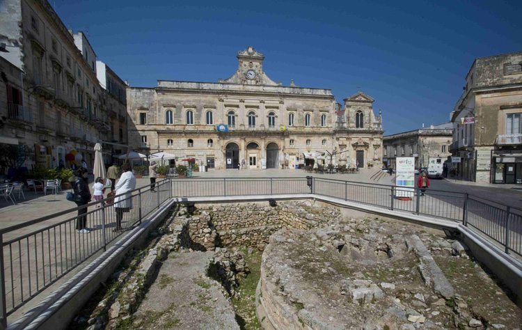 Il buon sant’Oronzo vede e provvede perché, per dirci sino in fondo la verità, sa bene che in quella piazza la forse ignara gioventù è nulla rispetto ai secoli dei secoli dello stupendo ex convento trecentesco ora sede del municipio, i lunghi corridoi e le stanze degli assessori nelle celle dei monaci perché si comportino bene. E la Biblioteca comunale, fra le più importanti della regione, oltre 60 mila volumi in gran parte affluiti a metà 1800 dai soppressi conventi: preziosa la Tabula Peutingeriana del XII-XIII secolo, fra le carte geografiche più antiche al mondo.
