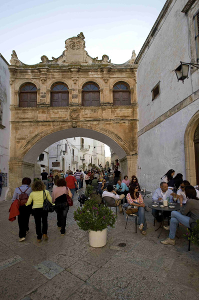 Ma Ostuni è anche il grande cuore di Piazza della Libertà, la piazza d’armi dei sacri furori della gioventù bruciata di abbronzatura. Qui la vita non si ferma mai, tanto è profonda la notte brulicante sotto gli ampi cieli mediterranei carichi di bontà. Qui il rutilare dei bar, i decibel delle musiche, l’ancata proterva delle ragazze in fiore, il cicaleccio degli incontri chissà quanto sono responsabili del cipiglio di sant’Oronzo, protettore di Ostuni quanto di Lecce, che dall’alto della sua decoratissima colonna sorveglia un po’ ricurvo di acciacchi.
