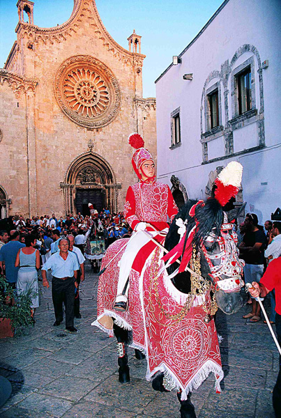 Il fatto è che se pulsa questa piazza, pulsa tutta Ostuni. E poi, proprio altro ci vuole per scomporre un santo che nel 1657 non indietreggiò nemmeno davanti alla peste. Anzi, contro la morte nera fu tanto energico da meritarsi non solo l’elezione a patrono, ma anche una rievocazione annuale di quei giorni. È la Cavalcata del 26 agosto, con la statua in argento in giro per i saliscendi vertiginosi scortata dai cavalieri in uniforme d’epoca.