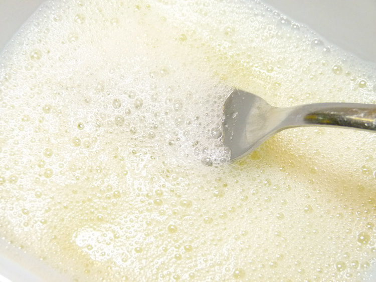 Sbattere molto a lungo con la frusta (anche elettrica) i tuorli con lo zucchero fino a ottenere un composto gonfio e di colore quasi bianco.