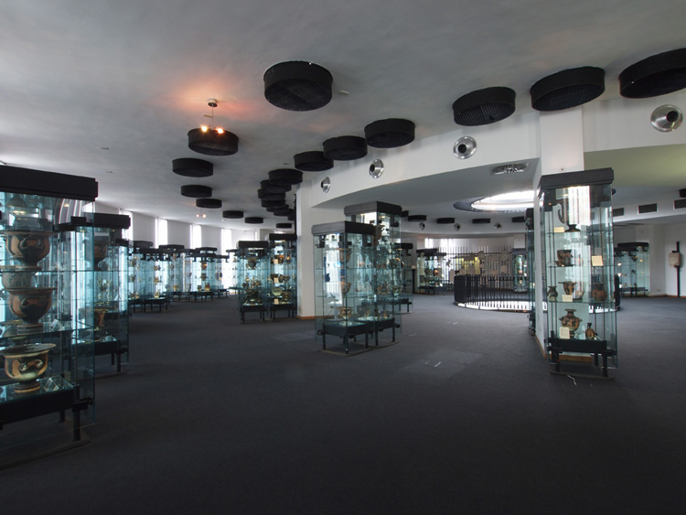 Qui, tutte le tipologie dei materiali (ceramiche, bronzi, terrecotte, vetri…) si offrono con le risposte a tutti gli interrogativi: come erano fatti, a cosa servivano, come sono stati trovati e restaurati. Tra quelli di maggior pregio e singolarità si segnalano: la pelike (vaso per contenere il vino e l’olio) a figure rosse con la raffigurazione di un antefatto della mitica guerra dei Sette contro Tebe, quello che riferisce del dono della collana di Armonia ad Erifile da parte di Polinice, perché la donna convincesse il marito Anfiarao a prendere parte alla spedizione, pur sapendo che vi sarebbe morto; l’anfora panatenaica con il colloquio tra Achille e Briseide, opera magistrale di uno dei primi e dei più bravi, il cratere a colonnette importato da Atene con i Sileni intenti a pigiare l’uva, i cinturoni in bronzo che facevano parte della armatura da difesa, il braciere per arrostire le carni e gli strigili in bronzo che servivano agli atleti a detergere il corpo e depilarsi. Segue la ceramica a vernice nera con sovradipinti motivi floreali, geometrici e anche figurati, in giallo, bianco e rosso. Molto bello e ben conservato il cratere con la menade danzante.