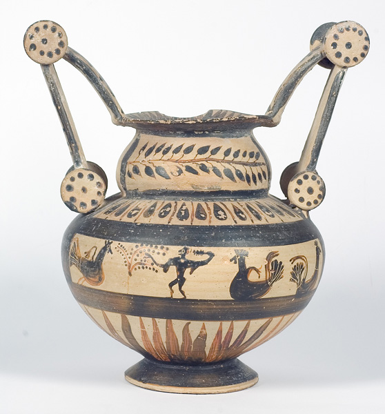 La ceramica messapica è, invece, caratterizzata dall’assenza di vernice e dalla decorazione eseguita a tempera in bruno e rosso con motivi vegetali e geometrici.