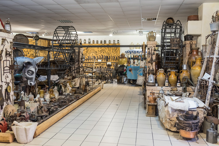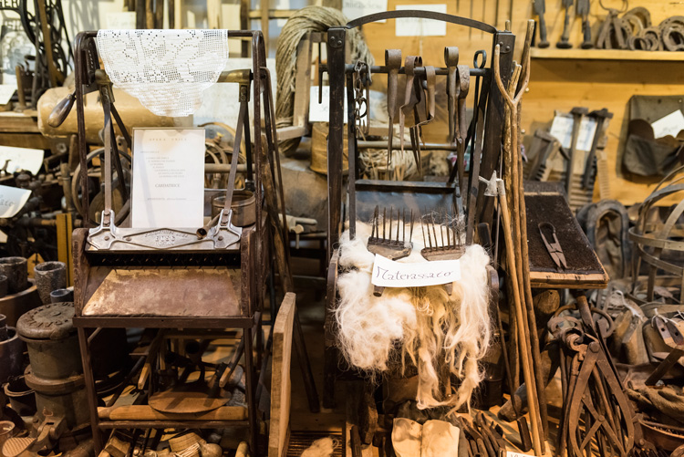 Il museo è articolato in diversi settori. Ci sono attrezzi collegati alle attività agricole: aratri in legno e in ferro, seminatrici, falciatrici, forche e forconi, imballatrici, pale, scale, pile in pietra, trappole, incubatrici per uova, attrezzi per la zootecnia. E poi attrezzi legati a tanti mestieri diversi: sellaio, maniscalco, scalpellino, spaccapietre, maestro d’ascia, carradore, falegname, fabbro, tornitore, arrotino, vasaio, conciapiatti, calderaro, calzolaio, cappellaio, spazzacamino, bottaio, ceraiolo, macellaio, tipografo, legatore e restauratore, orologiaio, banditore, lattaio, imbianchino, sarto, cardatore, materassaio, tessitore, noleggiatore di bici, lavoranti a tombolo. E attrezzi di uso casalingo: chiancarazze, schiacciafave, asciugapanni da braciere, secchi, bacili con supporto, bilance, tostatori, scaldini. C’è inoltre un vasto campionario di attrezzi per la vinificazione e distillazione del vino, per l’attività olearia, per l’attività casearia e molitoria e per la panificazione (macine a mano, pestelli, mulini, setacciatrici, laminatrici, cernitrici di cereali).